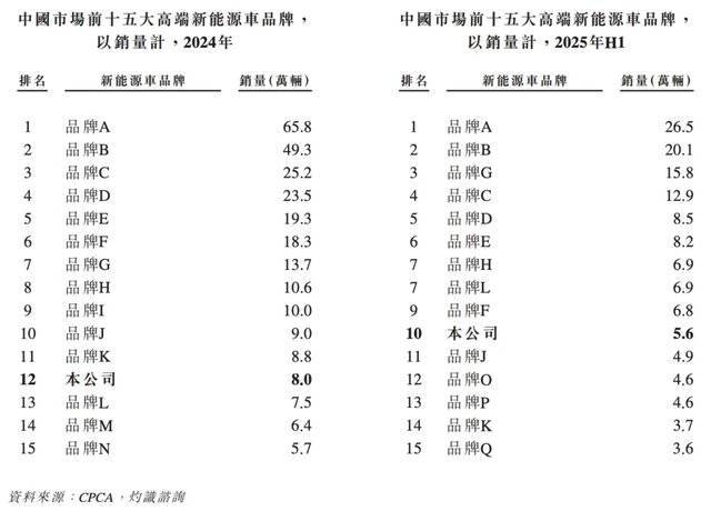 在中国高端品牌中,岚图2024年排名第12, 2025年上半年升至第10 图源 / 岚图招股书