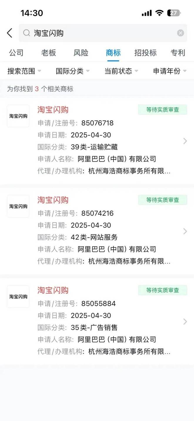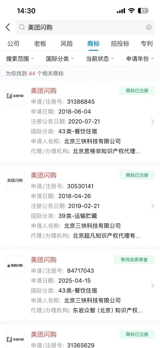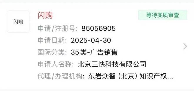 也怪美团当年没做好商标防护。他们虽然早在 2018 年就注册了“美团闪购”的商标,却唯独漏下了“闪购”这一核心名词。痛定思痛之下,美团的同学们赶在 4 月 30 日淘宝闪购正式推出的第一天,就跑去提交了“闪购”商标的注册申请,但现在还处在实质审查阶段。