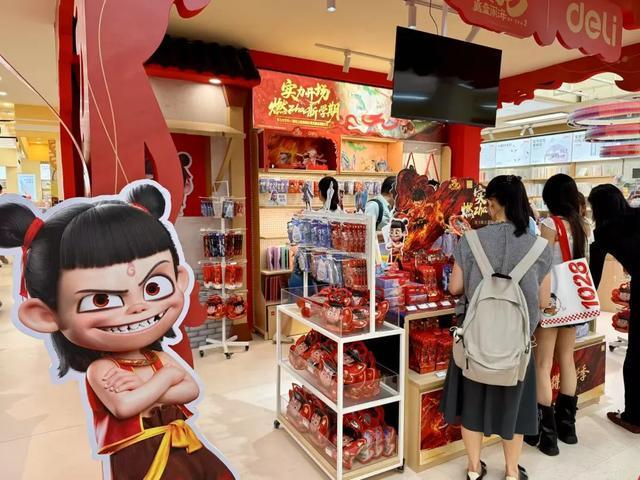 最新官宣的合作IP《哪吒之魔童闹海》系列专区霸占着快闪店的C位,一眼就能看见哪吒的“痛包”(“痛”为日语音译,现多指用喜欢的IP元素装饰相关物品)挂在显眼的位置,毛绒笔袋显示已断货。