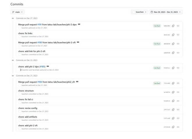 图片是Github上斯坦福大学的羊驼大模型小组tatsu-lab,在2023年10月到2023年12月的提交记录,提交者为Xuechen Li。Phi-2是当时(2023年底)一个备受关注的小型语言模型。SFT(Supervised Fine-Tuning)和 DPO(Direct Preference Optimization)则是对模型进行微调和对齐的关键技术。