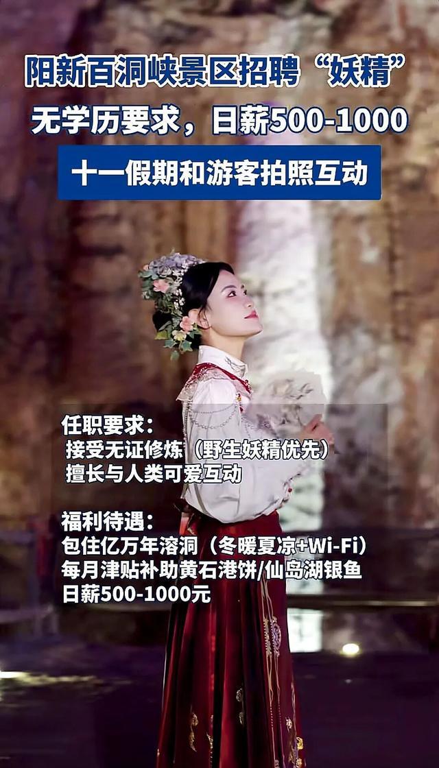 刚刚过去的“十一”假期,位于湖北省黄石市阳新县的百洞峡旅游区火了。该景区招聘了20余位溶洞“妖精”,与游客以多种方式互动,最高日薪达千元。此前,该景区招聘 “妖精”的启事,就吸引了广泛关注。招聘信息显示,对“妖精”一职无学历要求,日薪500—1000元,任职要求是需接受无证修炼,并备注“野生优先”。