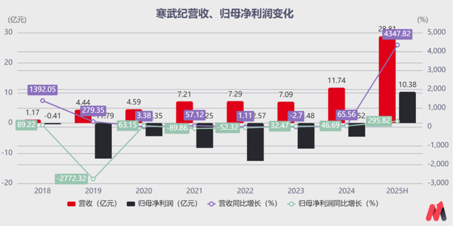 根据寒武纪公布的2025年半年报,公司业绩堪称惊艳。2025年上半年公司实现营收28.80亿元,同比增长高达4347.82%;归母净利润更是达到了10.38亿元,成功扭亏为盈。尤其是Q2单季度的营收和利润,环比Q1有巨大飞跃。
