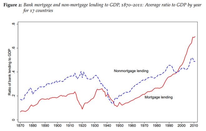 红线为房产抵押贷款对比GDP的比例,蓝线为非抵押贷款。可以看到二战后的趋势扭转和1980年代后期的迅速加速。