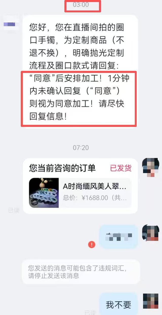 女子直播间花数千元买翡翠,问不清材质申请退货,在凌晨3时已入睡的情况下收到商家留言:“一分钟内回复同意加工,不回复视为同意”,被强制发货。收货后鉴定发现,手镯并非翡翠A货,而是平台禁售的翡翠B货(经过处理的玉石类如漂白充填翡翠)、C货(染色翡翠)。