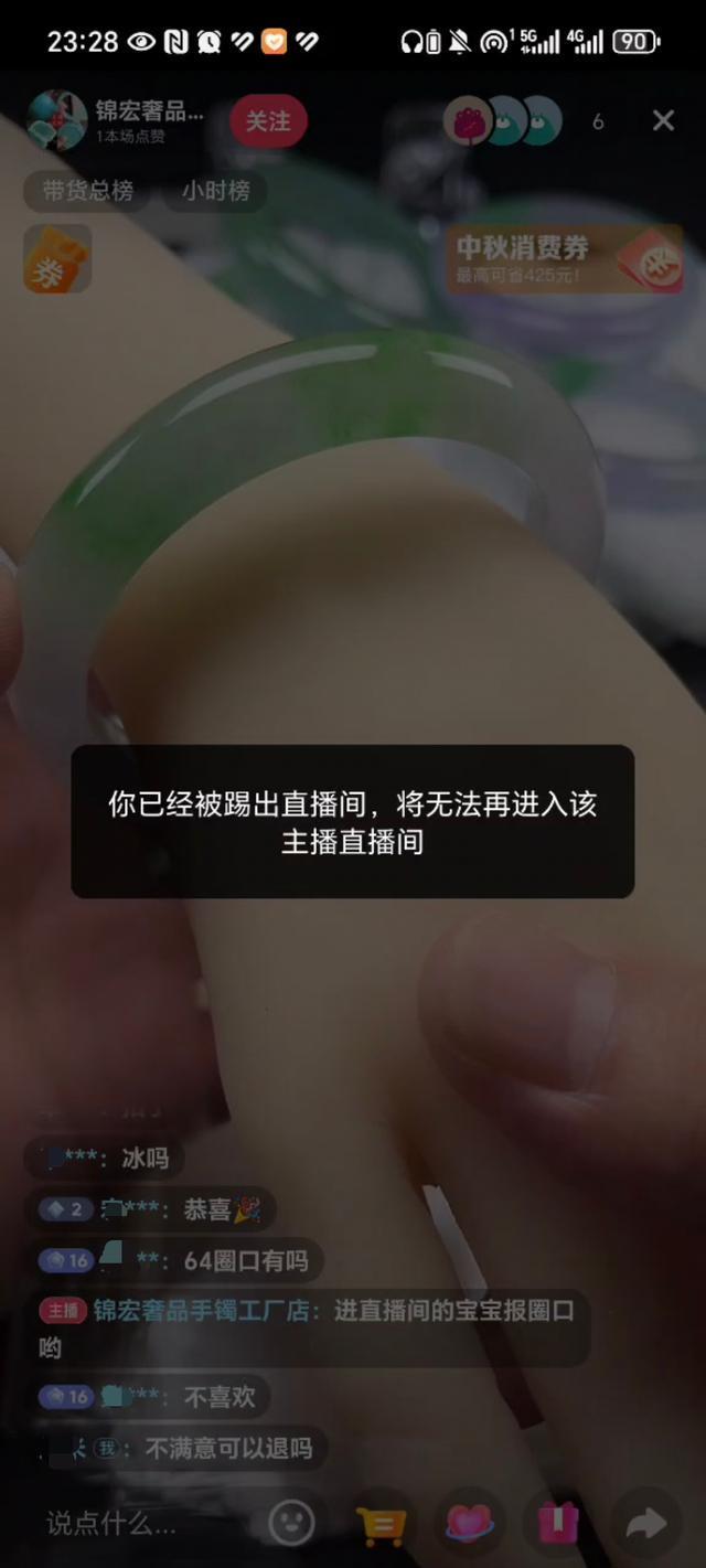 此外,主播还在评论区留言称“新号开播,下单送精抛光一次”。记者询问什么是“精抛光”?主播回复:“啥意思啊,没有看懂。”随后又称:“我们在源头,缅甸这边抛光手艺不怎么样,所以给新粉朋友送一个免费的精抛光。”那么,不满意可以退吗?该评论一发出,记者就被踢出直播间,尝试再次进入时,显示已被拉黑。