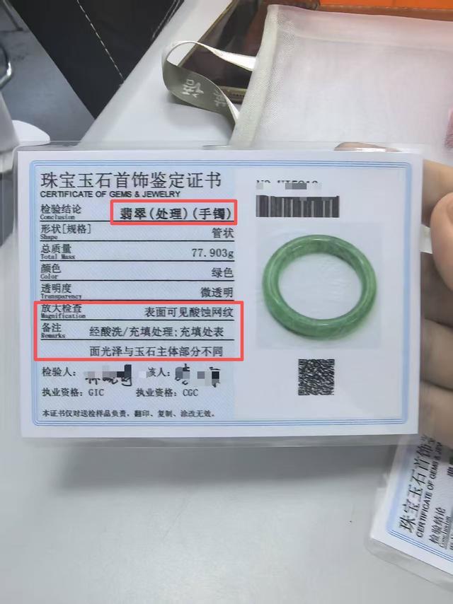 9月22日下午,程女士自行前往厦门市岩旷珠宝检测有限公司复检,程女士提供鉴定珠宝玉石首饰鉴定证书显示,两个手镯的检验结论均为“翡翠(处理)(手镯)”,管状、绿色、微透明;一个总质量51.546克,一个77.903克;放大检查均为表面可见酸蚀网纹,备注为经酸洗、充填处理,充填处表面光泽与玉石主体部分不同。