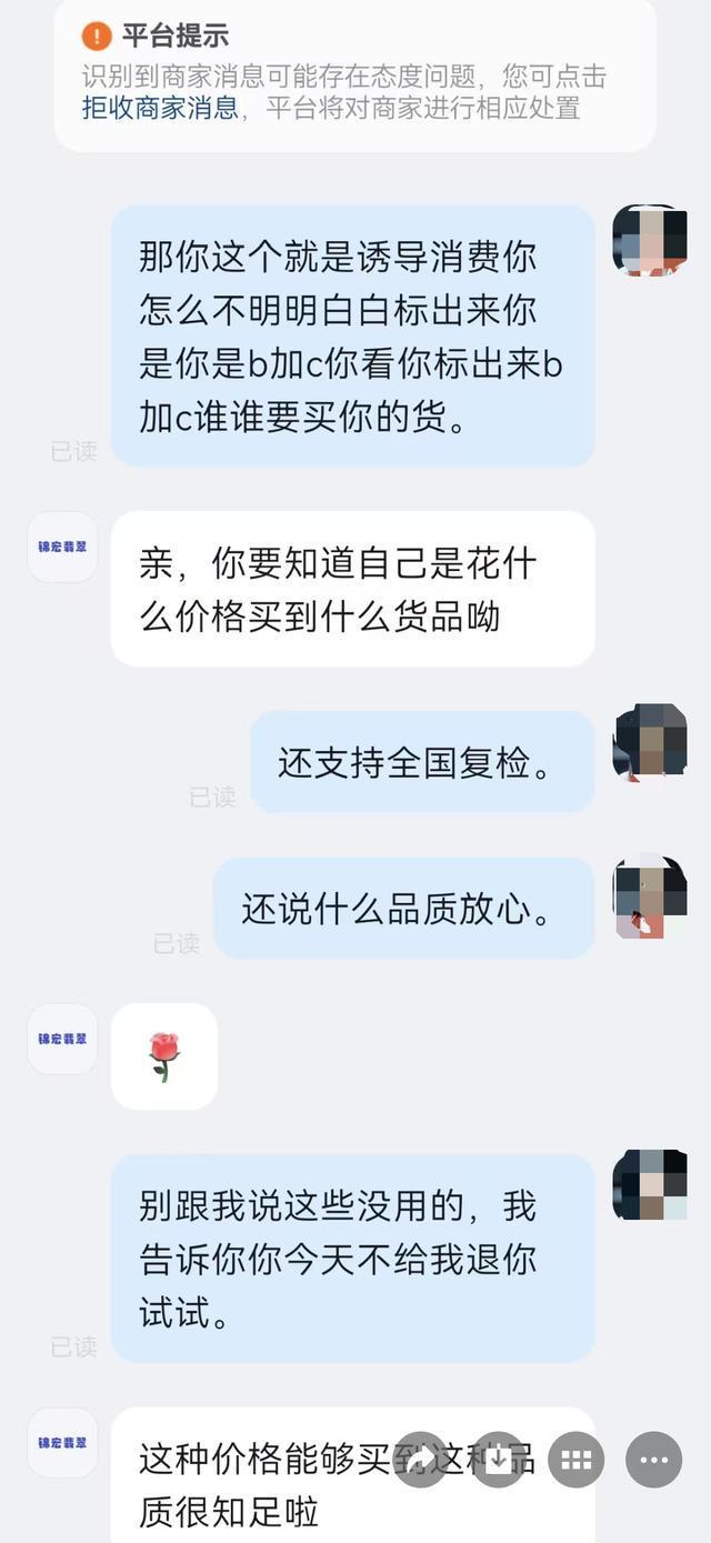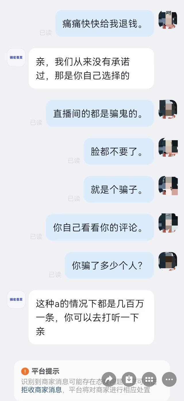 此后,程女士开始了漫漫维权路,“几次仲裁平台均支持商家,不支持我退货。”9月17日,抖音仲裁结果为平台支持商家。多个录音中,抖音客服以商品是定制产品为由,无法支持退货退款,建议程女士自行联系商家协商,并称程女士无鉴定证书等复检报告,也没有办法判断商家强买强卖。程女士表示,商家早已不回信息,自己疑被拉黑,无法进入直播间。