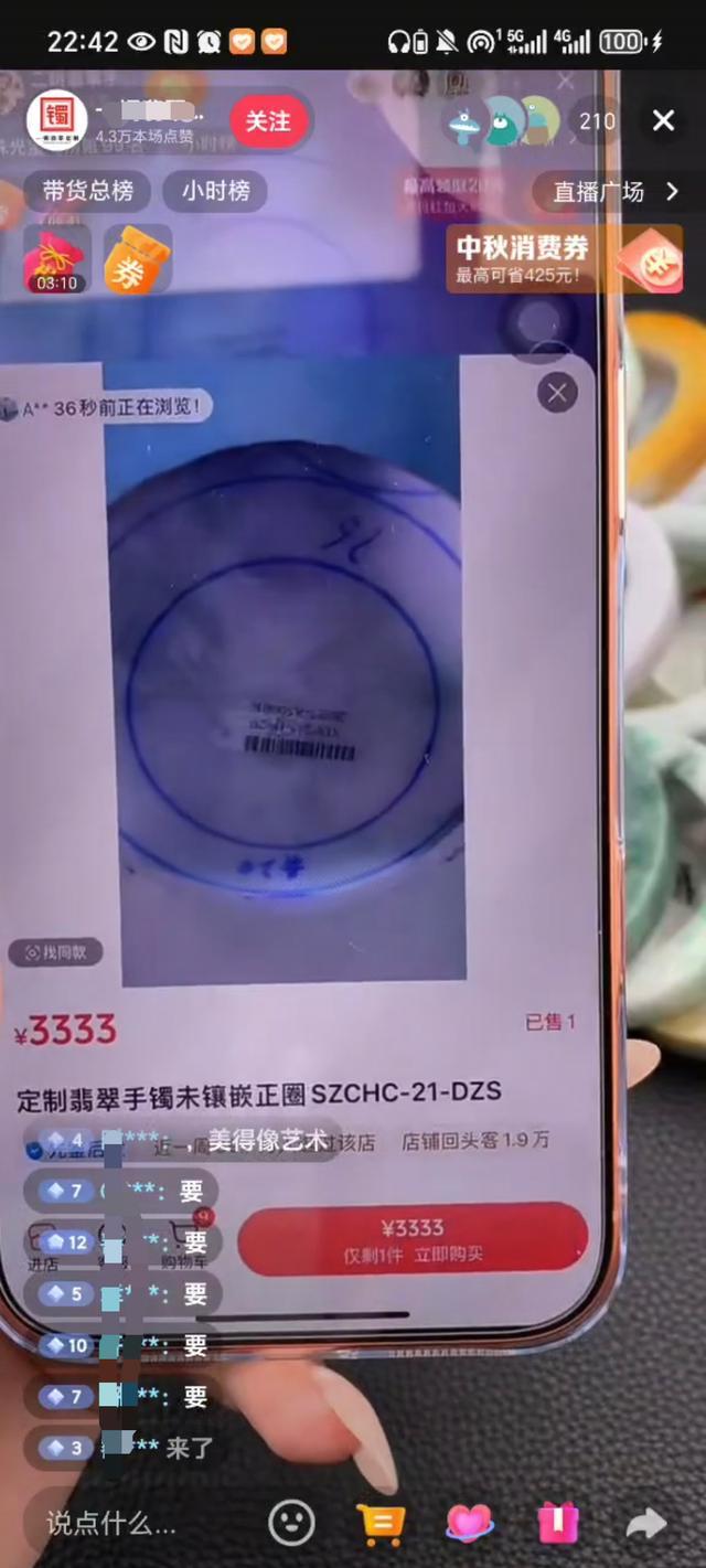 9月22日晚,记者以买家身份进入程女士购买翡翠手镯的直播间,直播间内手镯价格在1000至3000元不等,主播称全场皆为“缅甸翡翠”。记者追问是否为天然翡翠,主播始终未做回答。