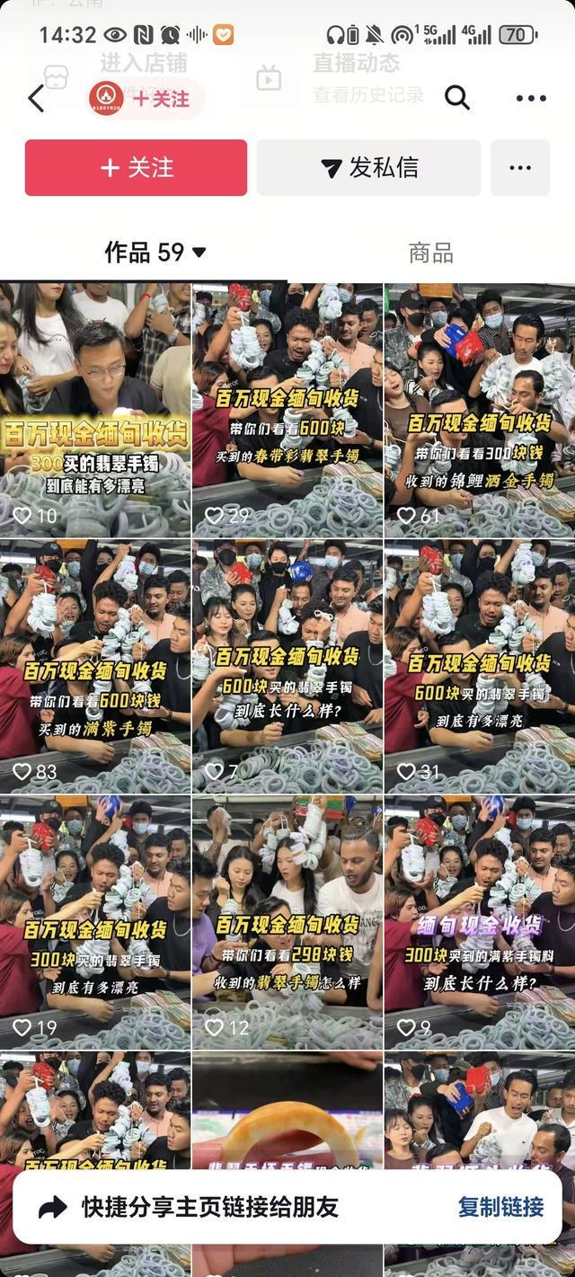 此外,华商报大风新闻记者还看到,抖音缅玉翡翠定制店账号中,发布大量视频,每条视频封面都是人山人海拥抢翡翠手镯的画面,配文字“百万现金缅甸收货”“600元买翡翠手镯”等。其账号简介中还称,“缅玉翡翠真源头,定制才是真翡翠,别人买镯你买矿,直播间不玩套路,现场收货,没有中间商赚差价。”然而,其账号IP显示为云南。