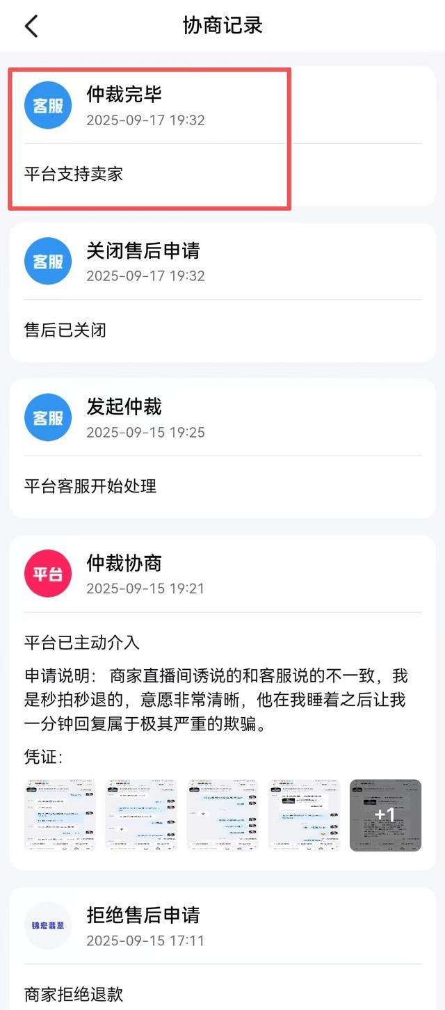 在李女士提供的申诉记录截图中,8月26日,李女士在平台申请售后,8月28日寄出商品,9月1日商家拒绝收货。抖音平台介入后,让买卖双方在仲裁界面举证,经电话催促,9月4日仲裁完毕,平台支持用户退款。