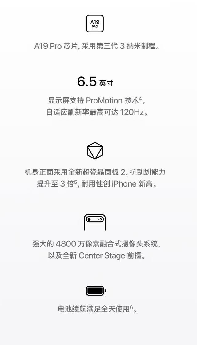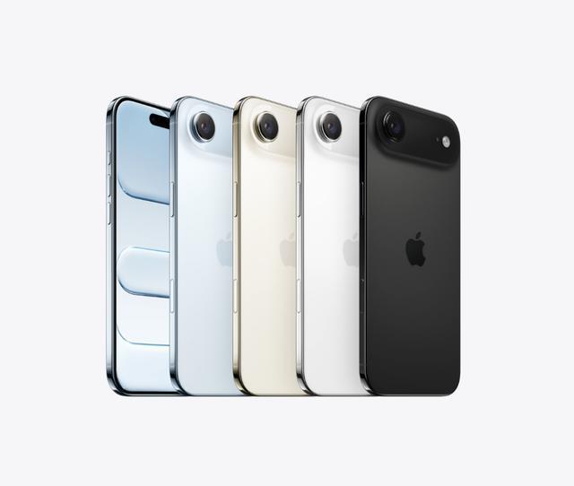 iPhone Air以轻薄和耐用为主要特征,采用钛金属机身和升级版超瓷晶面板,抗刮性能提升3倍。配备6.5英寸超视网膜XDR显示屏,支持120 Hz ProMotion刷新率。机型搭载A19 Pro、N1和C1X芯片,能效较前代显著提升。