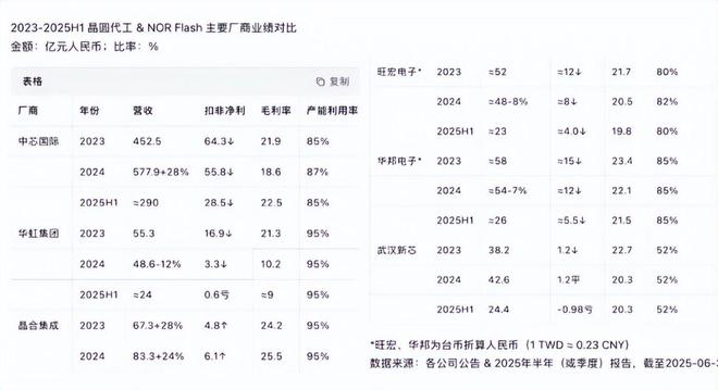 梳理行业其他代表公司2023-2025H1财务数据会发现:过去五年,NOR Flash 确实经历了“涨价—暴跌—弱复苏”的剧烈波动,但同期主要“友商(中芯、华虹、晶合、旺宏、华邦)”均能保持盈利,只是利润厚薄比景气高峰时期下滑。也就是说,其他公司即便在周期底部出现利润大幅缩水,仍能维持20% 上下的毛利率并持续盈利。