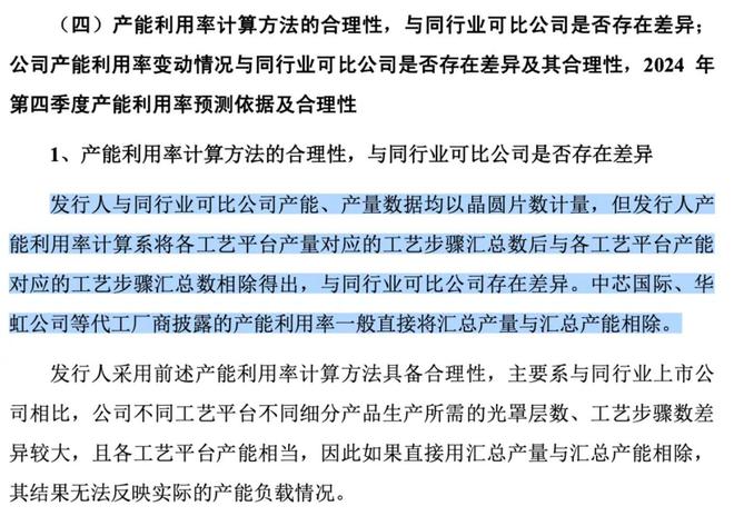 这种计算方法的合理性被问询时,公司在回复中坦承“同行业可比公司产能、产量数据均以晶圆片数计量….中芯国际、华虹公司等代工厂商披露的产能利用率一般直接将汇总产量与汇总产能相除。”