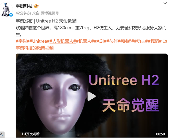 今日,宇树科技发布新款H2仿生人形机器人。官方介绍机器人高180cm,重70kg,视频中展示了舞蹈、功夫表演等能力。