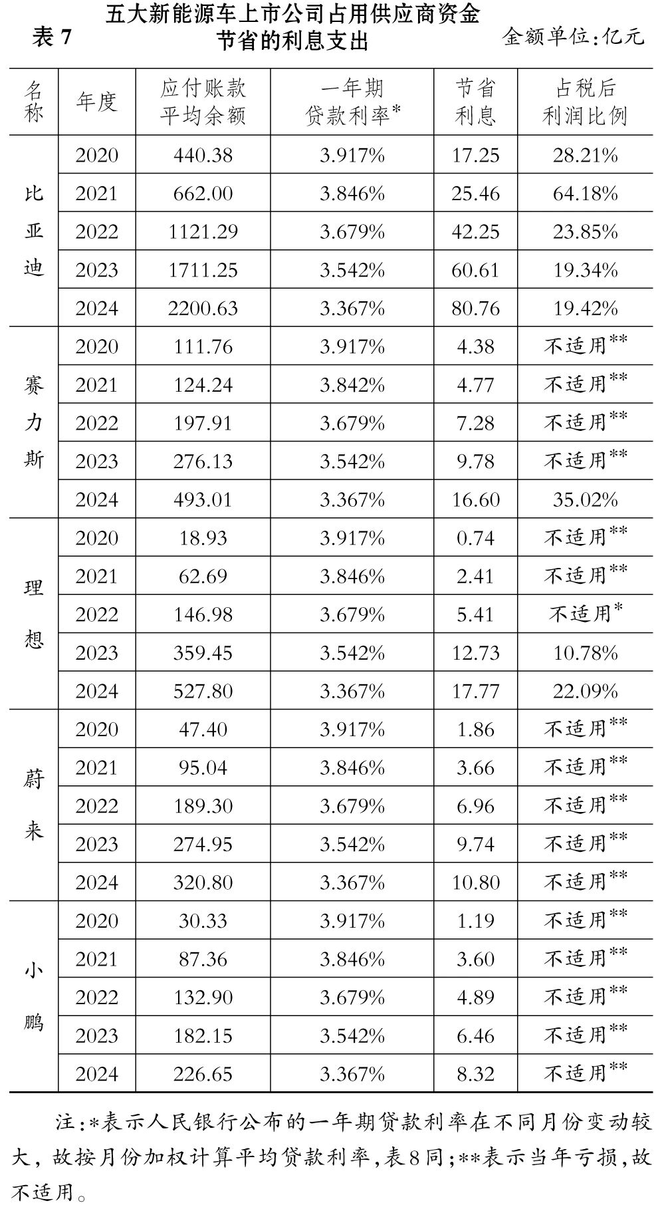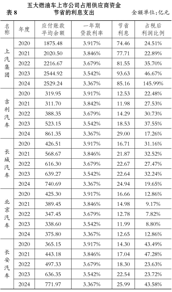 其中,上汽集团2024年占用供应商资金的效果最为突出:2529.24亿元的资金占用节省利息支出85.16亿元,占其税后利润的比例高达145.99%。倘若没有OPM战略带来的利息支出节约效应,上汽集团2024年的经营将由盈转亏。
