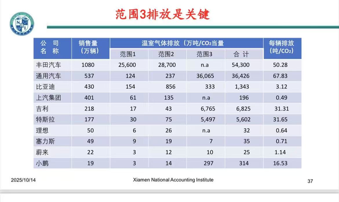 “在汽车行业,范围三的碳排放一般占所有碳排放的80%-90%,以通用汽车为例,其在2024年的销售量为537万辆,范围三的碳排放达36065万吨,相比之下比亚迪的范围三碳排放甚至低于范围一与范围二之和,两者在统计口径上或存在差异,”黄世忠教授向虎嗅分析道。
