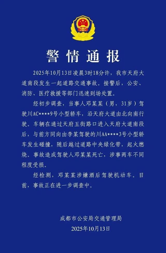 据警方的通报显示,10月13日凌晨3时18分许,当事人邓某某(男,31岁)驾驶小型轿车,沿天府大道由北向南行驶。车辆在通过天府五街路口进入天府大道南段后,与前方同向由李某驾驶的小型轿车发生碰撞,随后越过道路中央绿化带,起火燃烧。