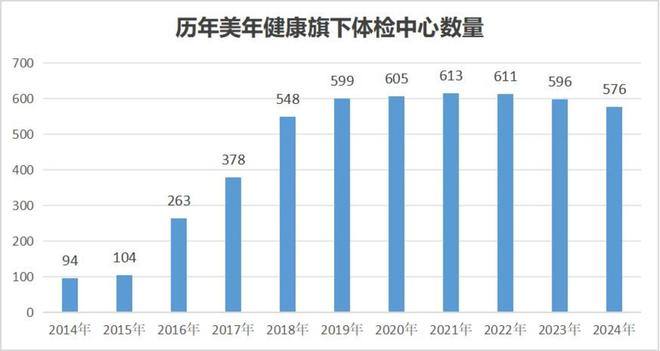 正是在这样的“顺风局”中,美年健康于2017年财报中喊出“2020年达到千店”的目标。但正所谓“谋事在人,成事在天”,突如其来的公共卫生事件,打乱了美年健康的扩张计划。此后的几年中,美年健康的扩张速度几近停滞,体检中心数量始终在600家左右,甚至在2021年达到613家的顶峰之后开始逐渐下滑。