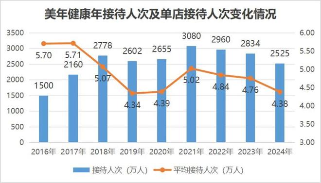 这点从客流量上也可以得到印证。近些年来,美年健康年接待人次和单店接待人次均呈现明显下滑趋势。2024年美年健康全年接待人次为2525万,比高点的2021年少了500多万人次。更要命的是,单店的接待人次也从2021年的5万一路下滑至2024年的4.38万。前者数值低于2019年的2602万人次,后者的数值也仅和2019年基本持平。