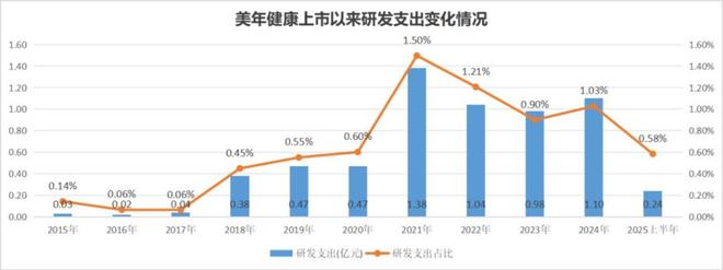 而且作为一个营收过百亿的企业,美年健康的研发投入长期不超过亿元,研发支出占营收比长期在1%以下。比如2025年上半年的研发投入仅为0.24亿元,研发占营收比仅为0.58%。这样微薄的研发投入,很难让人相信其能产出多少货真价实的创新科技出来。