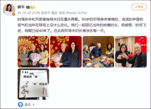10月22日,郎平更新微博:时隔多年和邓若曾指导夫妇在重庆再聚。89岁的邓导身体棒棒的,说话的声音和底气和当年在球场上没什么变化。我们一起回忆当年的拼搏时光,很感慨,时间飞逝,转眼已经40年了。在此祝邓导夫妇长寿快乐每一天。