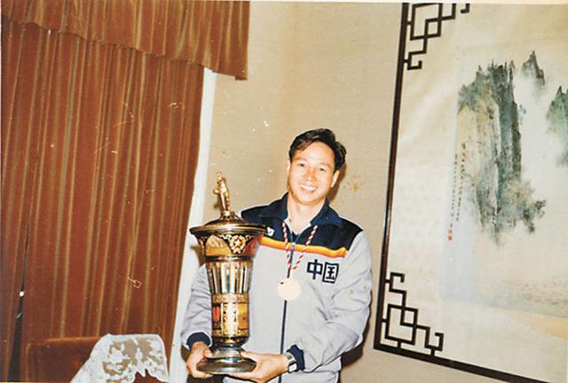 1982年,在第九届世界女排锦标赛上,中国女排夺得冠军。图为邓若曾怀抱奖杯。