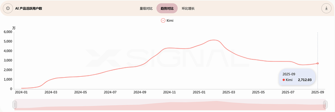 据Xsignal(奇异因子)数据显示,截至2025年9月,Kimi月活约 2700 万;前两名豆包与DeepSeek分别约2.5亿与1.7亿,量级差距被迅速拉开。而更刺眼的是结构性变化:在字节、腾讯系的“超级分发”夹击下,Kimi 的自然增长并未形成可替代的流量闭环。