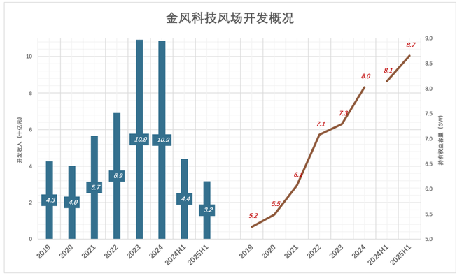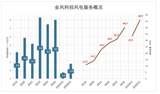 2018年末,金风科技国内外服务业务在运项目为7GW,2021年末达23GW,2024年末增到40GW,2025年6月末达46GW。