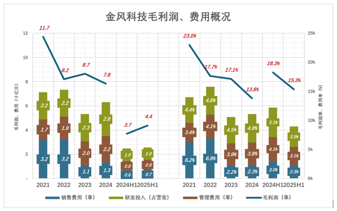 2021年,金风科技一派绩优蓝筹股气象——蓝色高高在上,毛利润117亿,利润率23%;总费用71亿、总费用率14%; 2022年,毛利润跌至82亿、利润率17.7%;总费用升至73亿、总费用率15.8%,蓝色与彩色空前接近; 2023年,毛利润回升至87亿、利润率17.1%;总费用大幅降至53亿、总费用率10.6%,蓝色与彩色再次远离; 2025年H1,毛利润、总费用分别为44亿、26亿。总费用率比毛利润率低6.4个百分点。