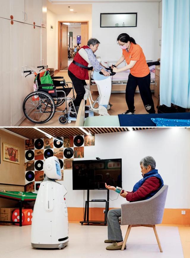 下图:在浙江杭州市西湖区社会福利中心,老人使用智慧养老机器人测血压。图/中新