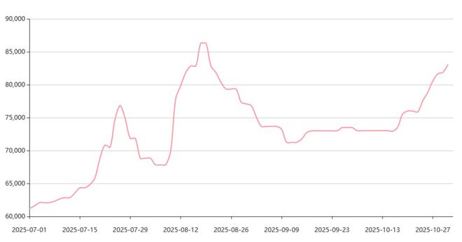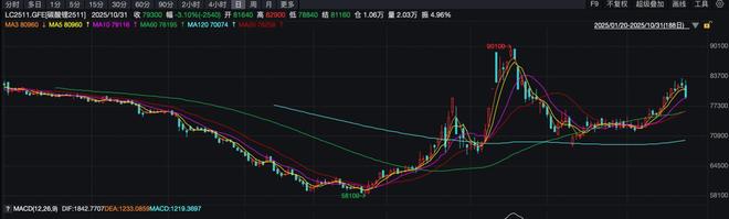 现货价格基本复制期货走势。上海钢联数据显示,8月19日电池级碳酸锂均价86500元/吨,较6月30日打的61400元/吨上涨了40.88%;之后也是快速回落-企稳-再度反弹,10月31日均价83600元/吨。![]()