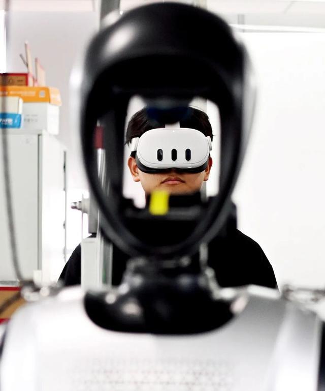 2025年3月27日,广东深圳一家机器人技术公司内,工作人员在操控机器人同步动作。图/新华