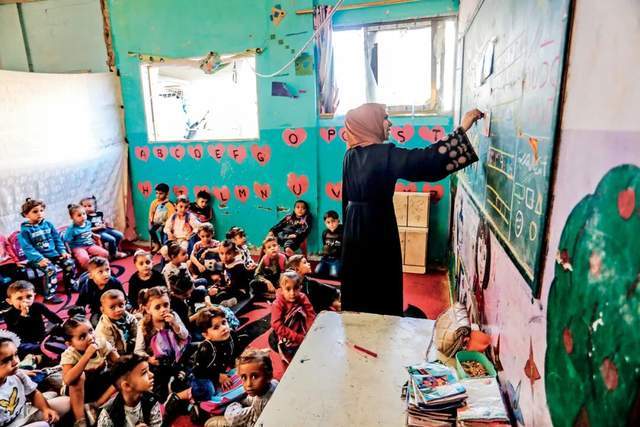 10月21日,加沙地带汗尤尼斯,巴勒斯坦教师们在自己家中为儿童授课。图/视觉中国