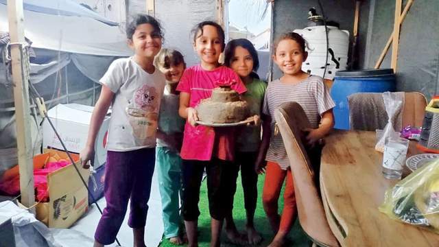 当我坐在帐篷里,想着下一步该做些什么时,我的孩子们给了我一个惊喜——他们用沙子做了一个蛋糕来庆祝停火。孩子们可能都已经忘了鸡蛋是什么味道了,但他们没有忘记庆祝的意义。