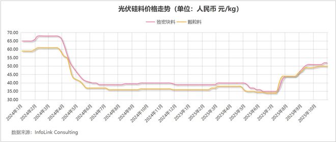 硅料方面,根据新能源研究机构InfoLink Consulting公布的最新统计数据,截至10月底,致密料交易均价为52元/kg,单月上涨1.96%,年内上涨33.33%。不过,硅料价格2024年跌幅较大,目前该品类价格相比2024年初仍低20%。