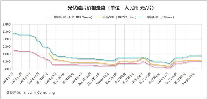 N型210mm在10月份的交易均价同样无变化,仍为1.7元/片,年内累计上涨21.4%,较去年同期水平高17.24%,但比2024年初仍低46.88%。