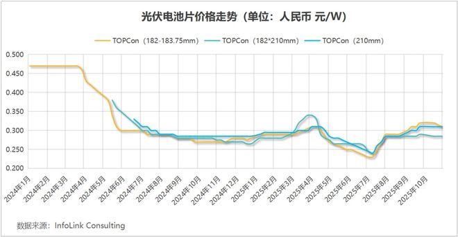 N型210mm TOPCon电池片目前交易均价与9月底持平,为0.31元/W,该品类价格年内至今涨幅为8.77%。
