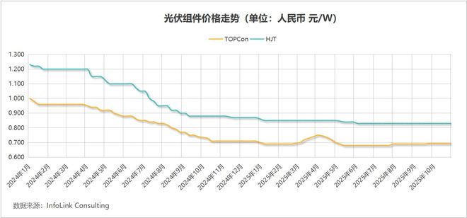 根据InfoLink的统计,截至10月底的TOPCon组件价格为0.693元/W,HJT组件价格为0.83元/W,月内均无变化。