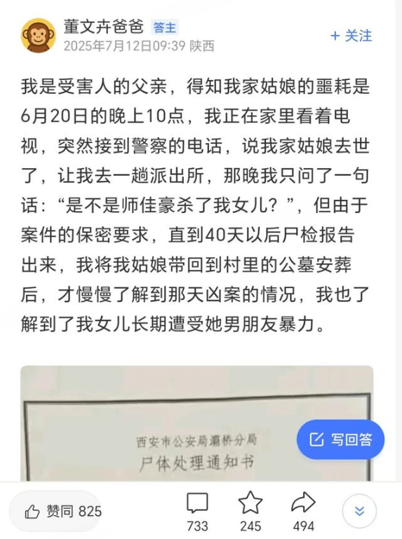 2024年6月21日,师某某因涉嫌故意杀人罪被西安市公安局灞桥分局刑事拘留,同年7月25日,其被灞桥区人民检察院批准逮捕。2025年7月11日,检方以故意杀人罪提起公诉。
