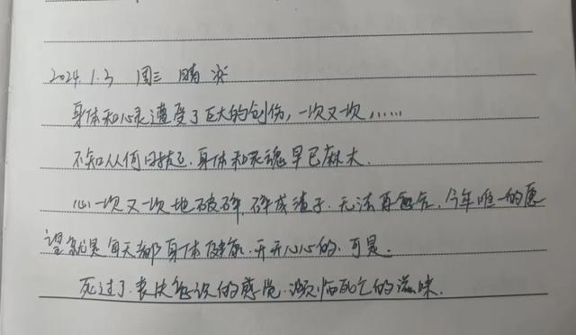 案发后,他从女儿的日记本里得知更多情况。2024年1月,女儿的日记本多次提到,“被人威胁,被人拿着刀架在脖子上,有家不可回”“恐惧、害怕、无助、彷徨”“2024年开始快一个月了,但这一个月就像地狱一样,已经记不清第几次被勒脖子了”。