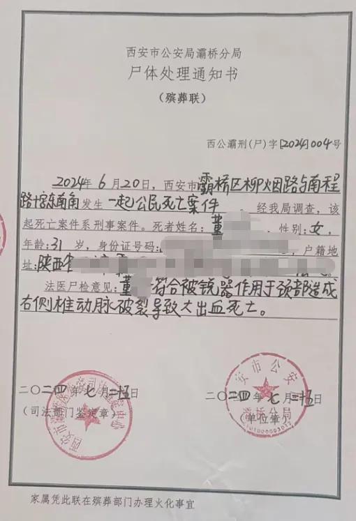 西安市公安局灞桥分局出具的《尸体处理通知书》显示,小卉符合被锐器作用于颈部造成右侧椎动脉破裂导致大出血死亡。