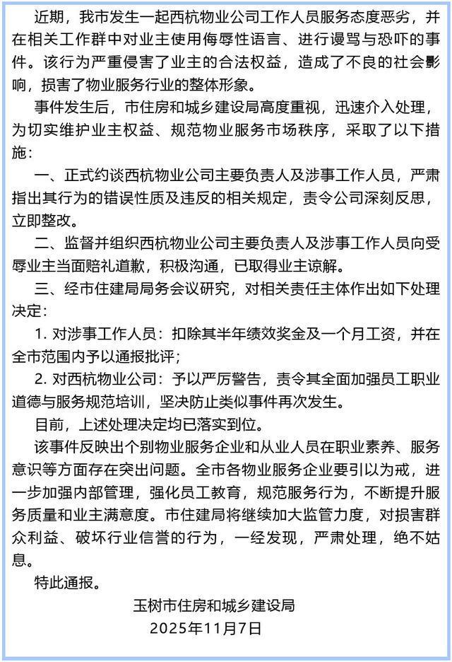 11月7日,玉树市住房和城乡建设局发布关于西杭物业公司工作人员服务态度问题处理情况的通报: