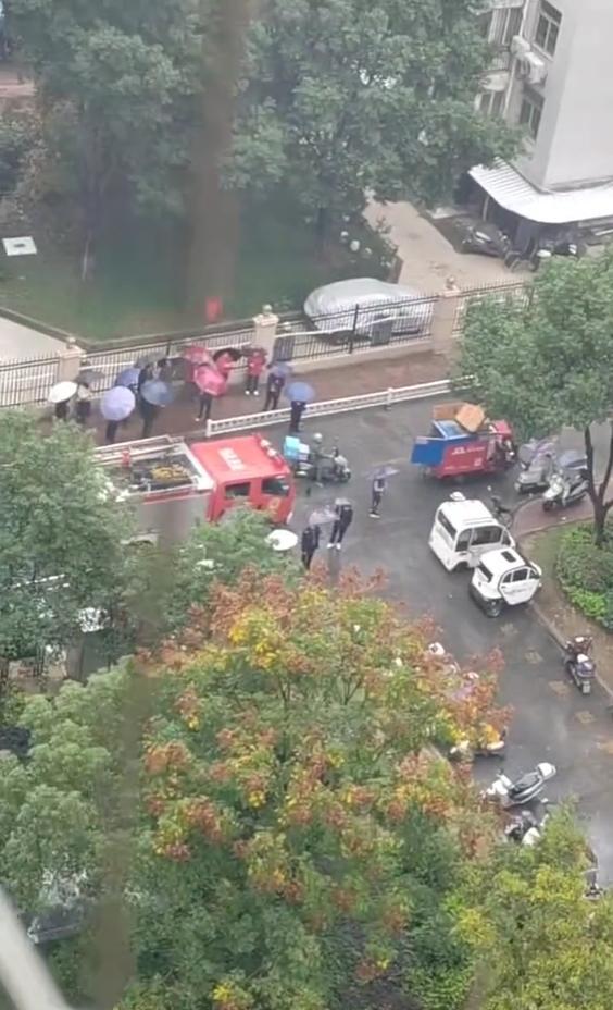 现场视频显示,发生火灾的一户人家里,伴随着浓烟蹿出明火。小区通道边上停有不少电动车,多位业主撑着雨伞在现场看消防扑救。