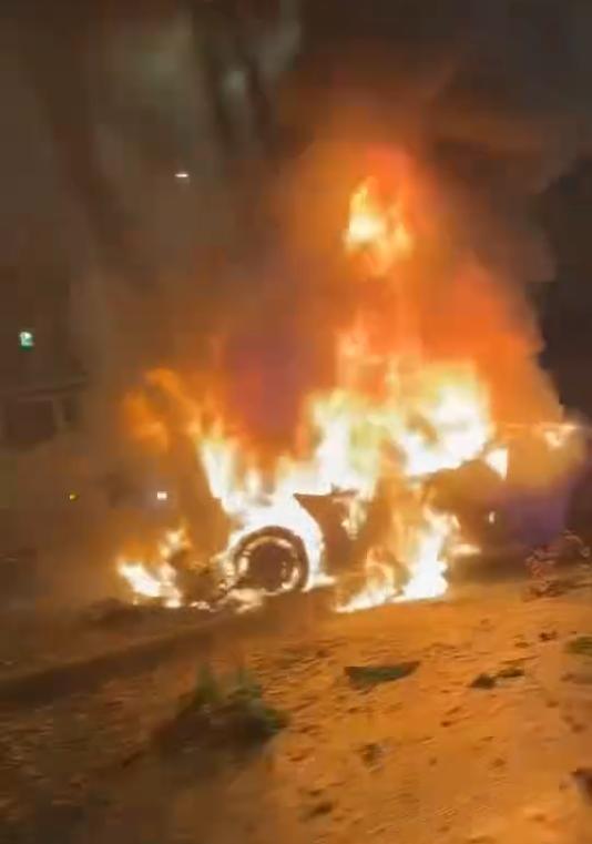 网上多段视频显示,一辆小汽车冲上绿化带后车头燃起大火,火势迅速蔓延很快将车身吞噬,但车尾的兰博基尼标识依然清晰可见。