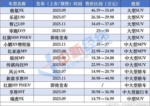 从级别来看,今年下半年以来发布的9系车集中在大型车及中大型车领域。如智己LS9是一款大型SUV,小鹏X9增程版是一款中大型MPV。