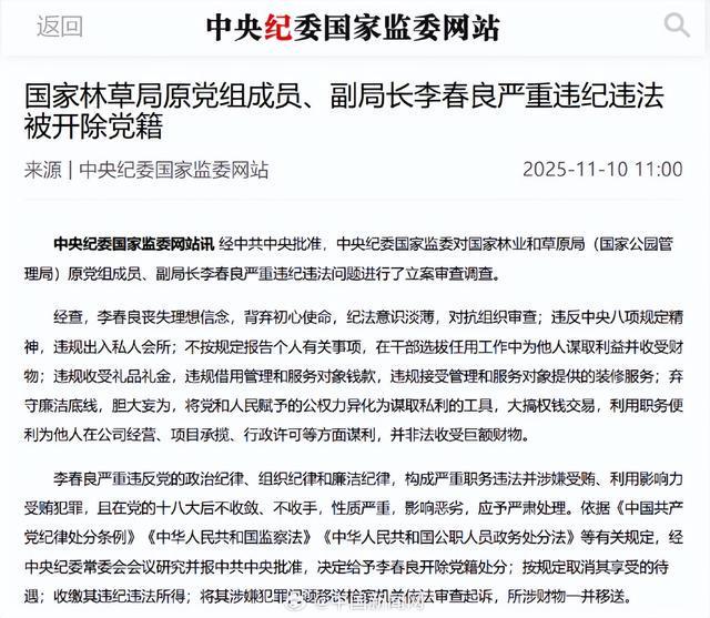 李春良严重违纪违法被开除党籍,国家林草局原党组成员、副局长遭处分