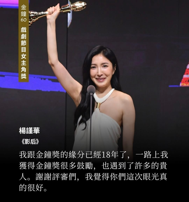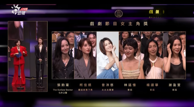 在台剧《影后》里饰演过气女明星的杨谨华,终于凭借该剧在今年获得了第60届金钟奖戏剧节目女主角奖。入围的还有同剧组的谢盈萱和林廷忆,凭借《童话故事下集》再度入围的柯佳嬿,在《太太太厉害》中饰演高智主妇的曾沛慈,和以《化外之医》首度角逐金钟视后的张钧甯。除了林廷忆外,其余几位年龄都超过了40岁。