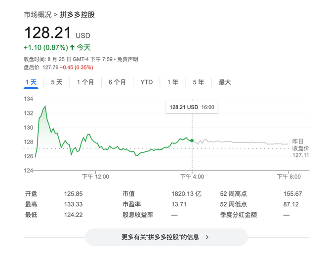 电话会结束,拼多多美股股价涨幅不再,一路从大涨 10%缩减至持平。昨日美股收盘,拼多多股价 128.21 美元,涨幅仅 0.87%。
