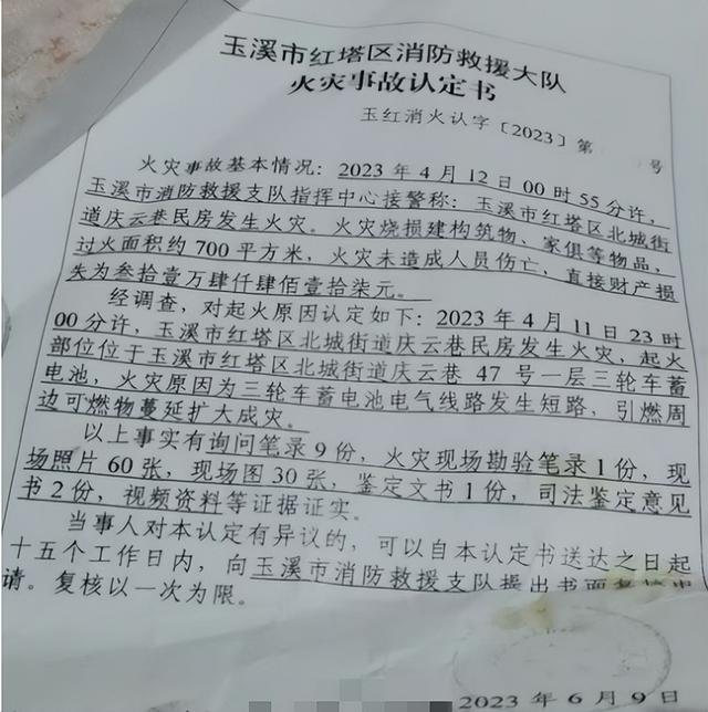 2023年6月9日,玉溪市红塔区消防救援大队出具的一份《火灾事故认定书》证实了该受灾居民的说法。
