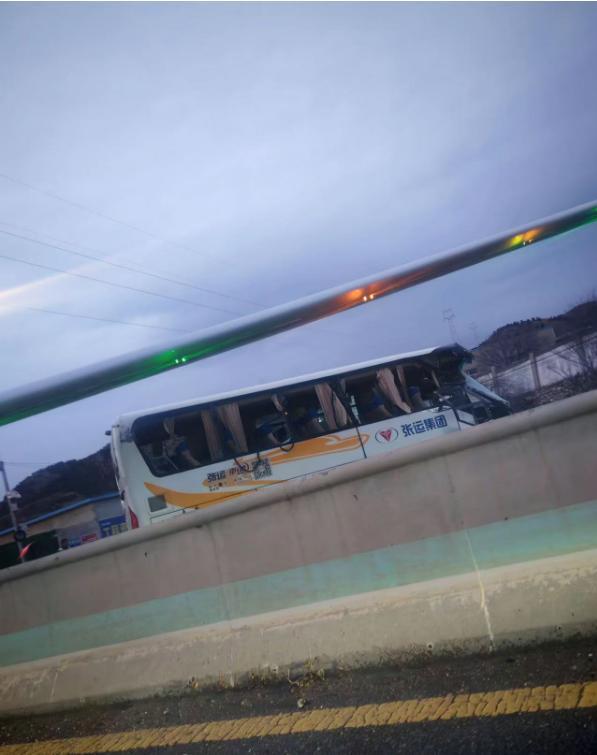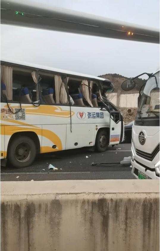 现场视频显示,一辆货车上拉运的风电桨叶疑似受损,一辆车身喷印有“张运集团”标识的大巴车车头处损毁严重,车身右侧车窗玻璃破碎,车门处变形。